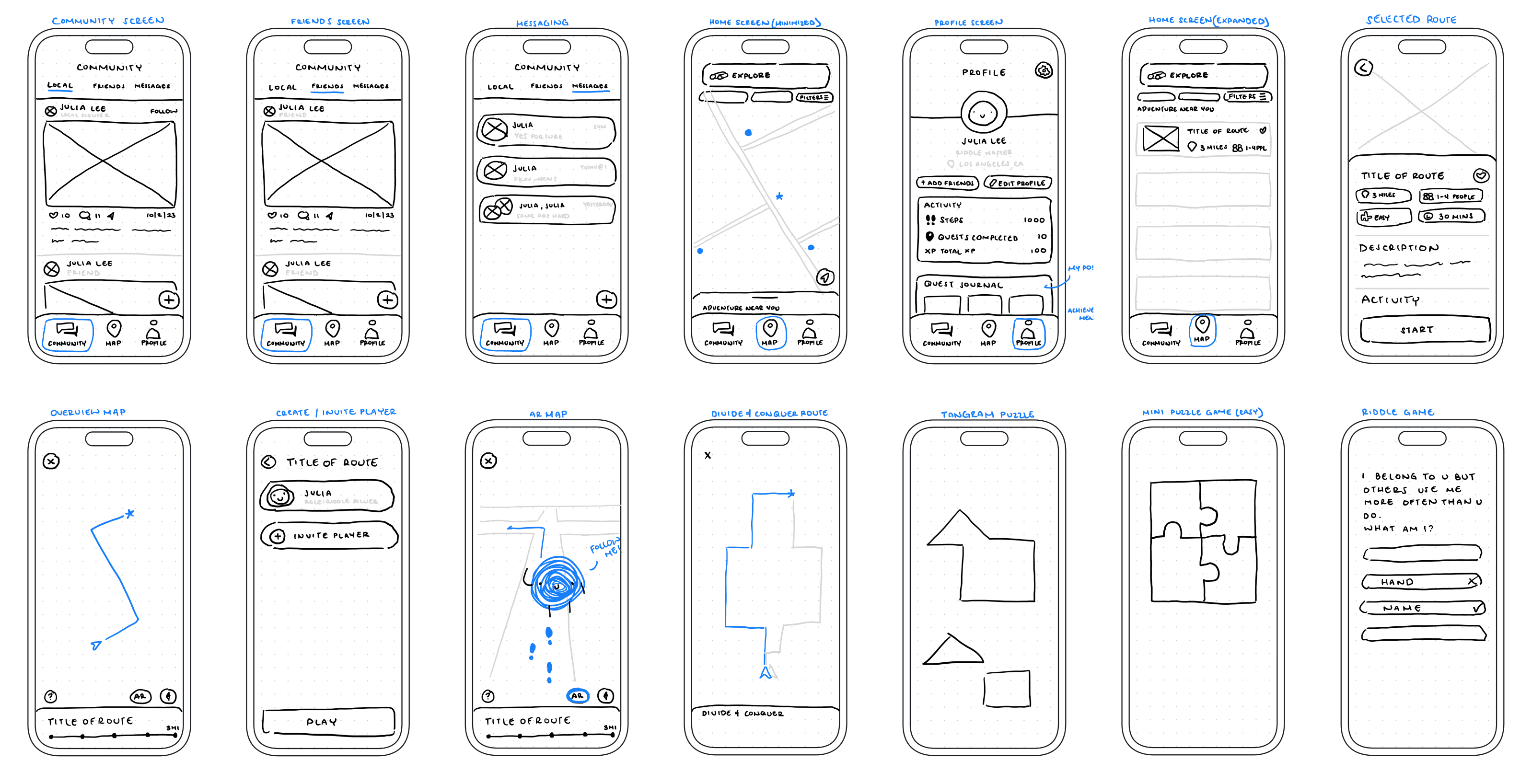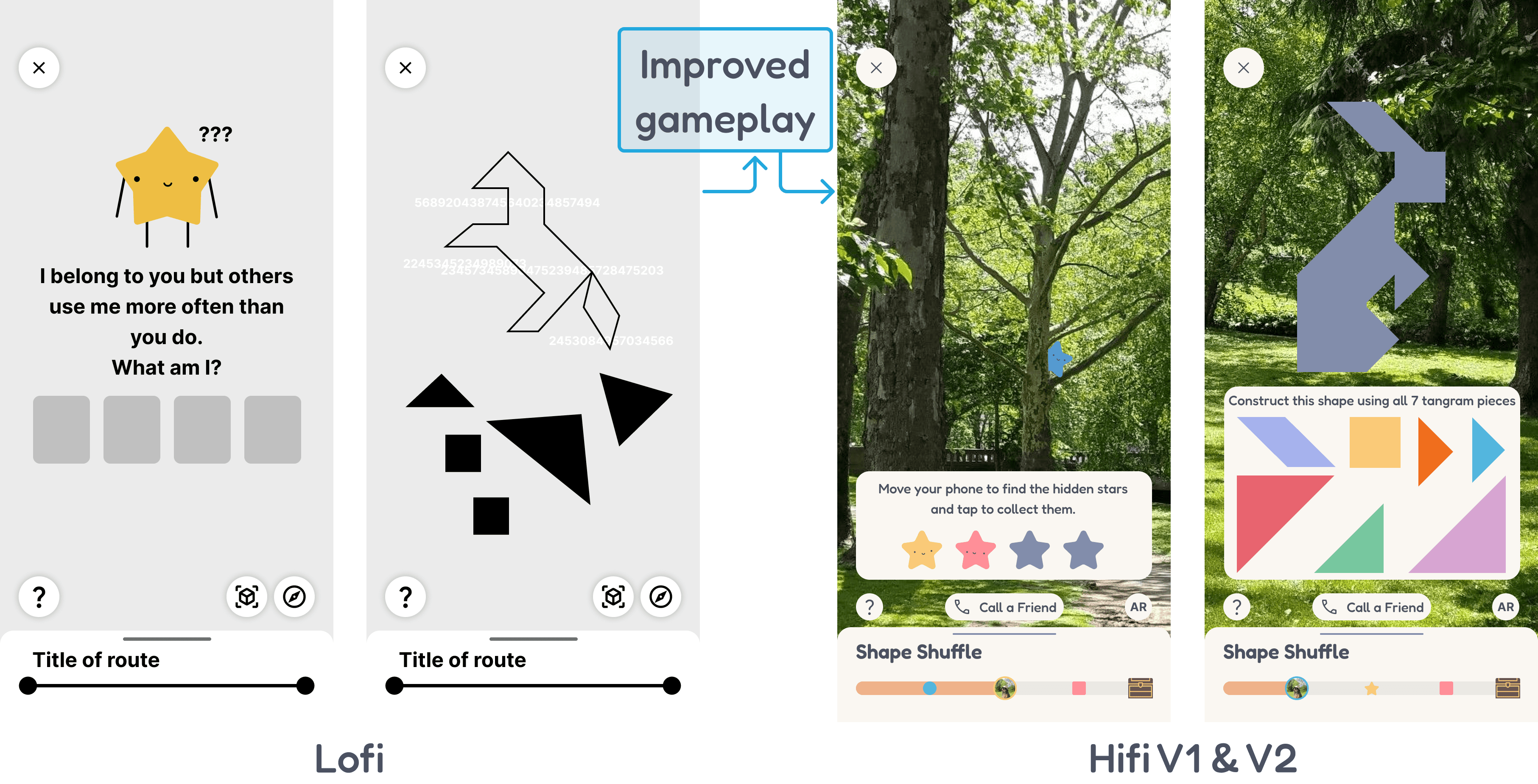 The lo-fi wireframes and sketch iterations focus on creating seamless and well-integrated gameplay when flipping between the physical and digital worlds (AR functions).
