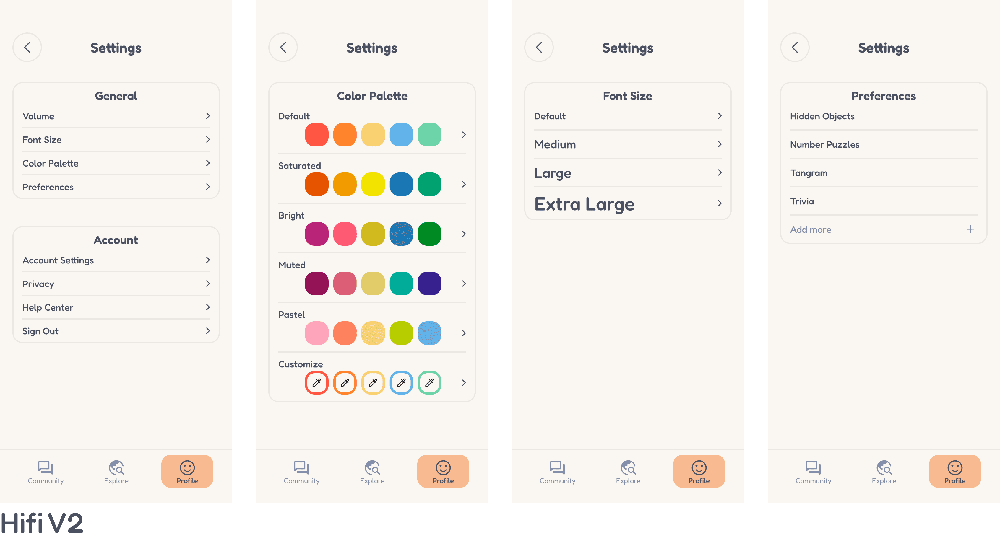 For visual accessibility, I incorporated customizable font sizes and colors catering to diverse visual abilities. The app's visual elements feature minimalistic and friendly designs, using simple shapes and colors, creating a universally accessible and user-friendly experience.