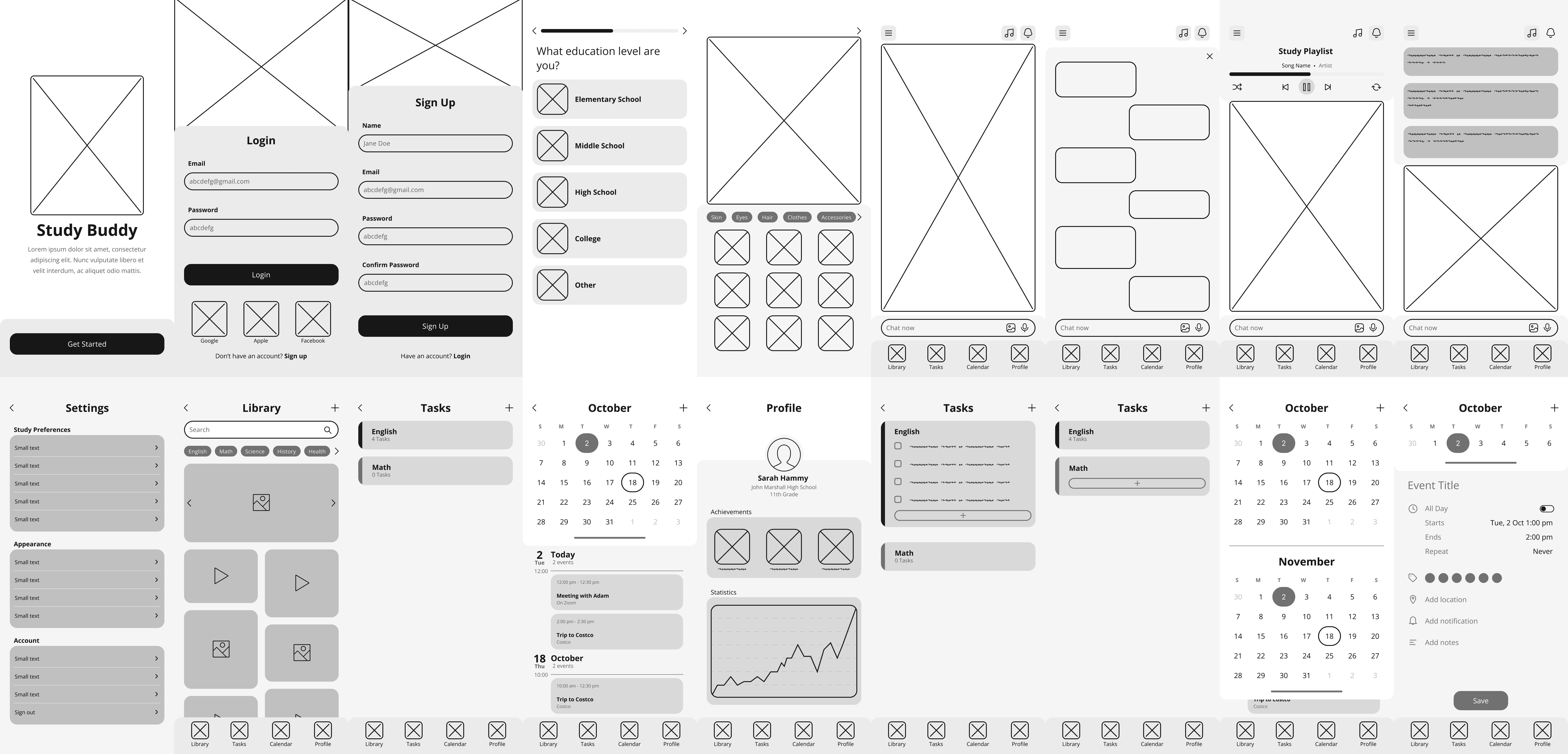 Using the site map, I sketched out the screen layouts with low-fidelity wireframes. I prioritized placing the AI at the center of most screens to emulate a study partner working alongside users.