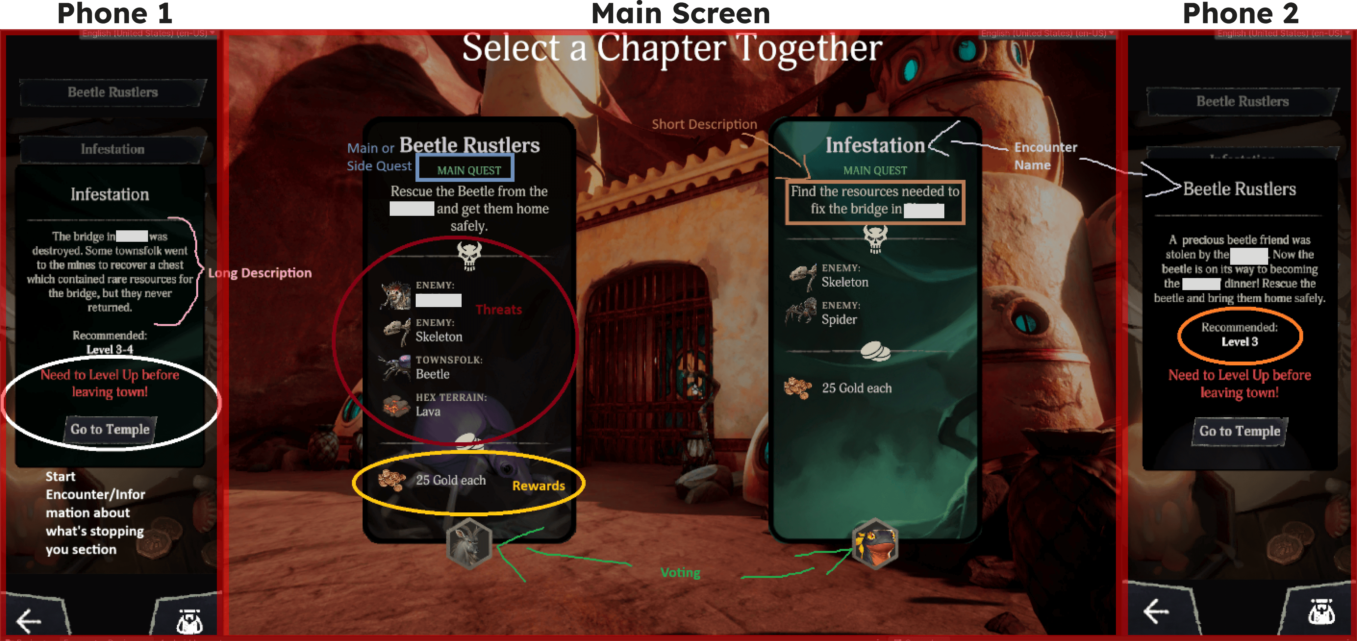 With a clear understanding of layout organization, I moved forward with the visual design of the main and personal screens. I focused on making information digestible and intuitive through thoughtful use of 2D art, iconography, and labeling.