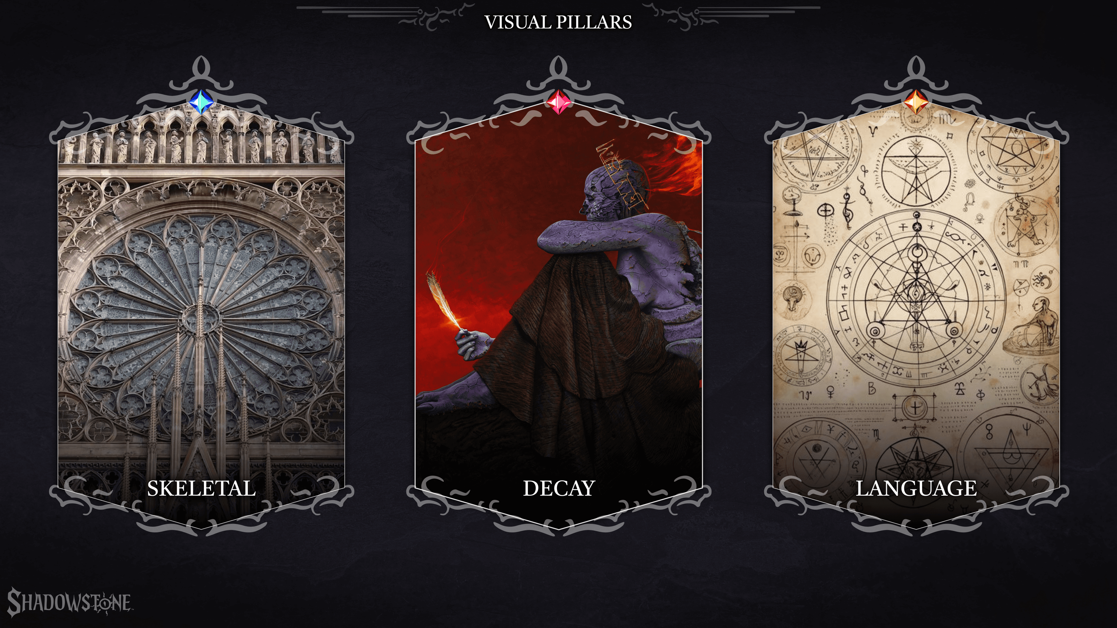 Shadowstone’s Arcane Horror theme was reinterpreted as a Gothic Curse UI style. The interface is built around three core visual pillars skeletal, decay, and language. This is expressed through sharp shape language, dead foliage, traditional typography, and ancient iconography. Together, these elements reinforce the game’s dark atmosphere while maintaining clarity and usability across the UI.